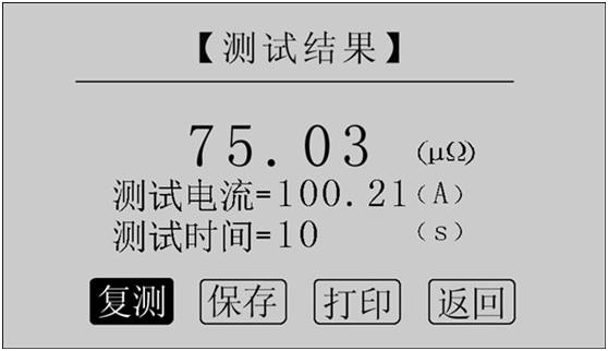 讀取測試結果,正在測試時,系統顯示“停止”,“返回”項。點擊“停止”,系統停止計時,電流停止輸出。點擊“返回”,系統停止計時,電流停止輸出并返回上一界面。注意:開始測試的前幾秒,由于電流沖擊和電容充電,測試結果不穩定,5s后測試結果穩定,用戶即可記錄數據。