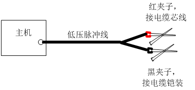 低壓脈沖測試法只需要將低壓脈沖線有插頭的一側(cè)插入主機(jī)“信號(hào)”接口。測試線的紅色夾子夾在A 、B、 C 三相的某一相上, 黑色夾子夾在電纜的“鎧裝”上面。