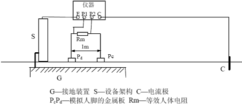 式中Is 為被測接地裝置內(nèi)系統(tǒng)單相接地故障電流。上述測量中,若儀器電壓輸入端不并聯(lián)等效人體電阻Rm,則所得結(jié)果為跨步電位差。