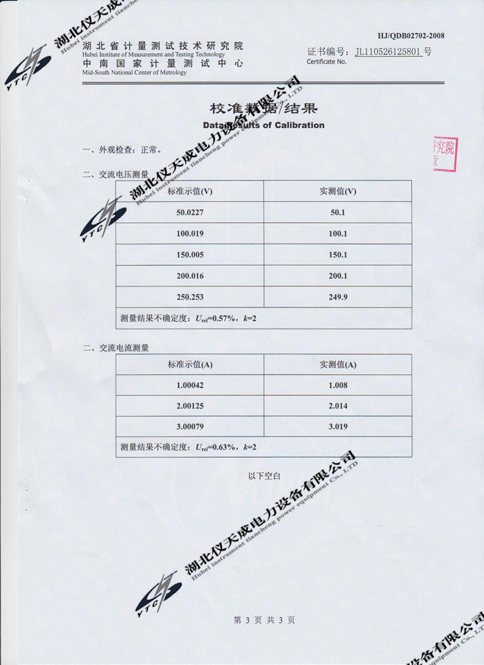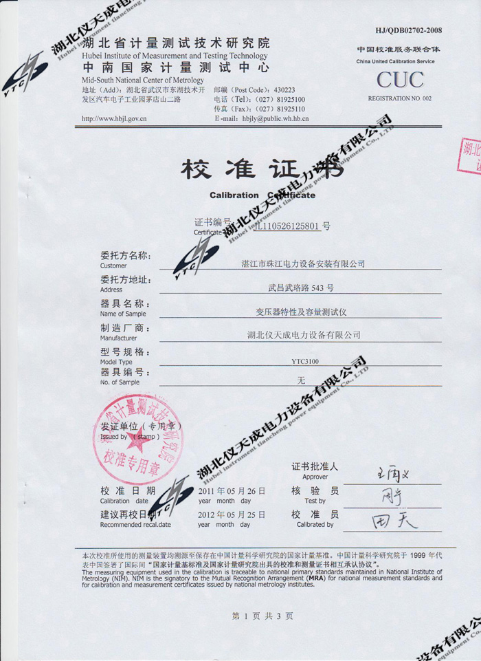 YTC3100變壓器特性及容量測(cè)試儀的資質(zhì)證書(shū)