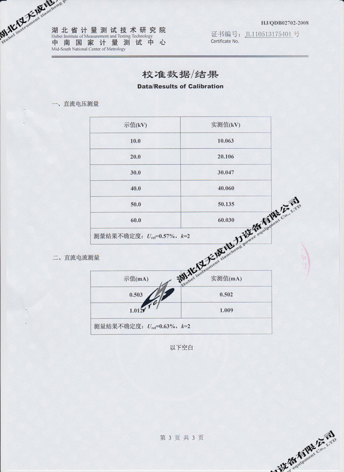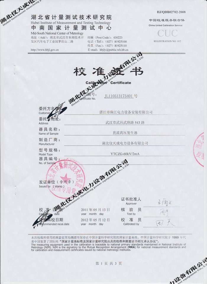 轉(zhuǎn)載:"YTCZG-60kV/2mA直流高壓發(fā)生器的資質(zhì)證書(shū)" 請(qǐng)注明來(lái)源于儀天成電力。 更多技術(shù)問(wèn)題請(qǐng)致電儀天成電力客戶(hù)服務(wù):027-87876585,技術(shù)部專(zhuān)線(xiàn):027-87876585,在線(xiàn)客服:719388481