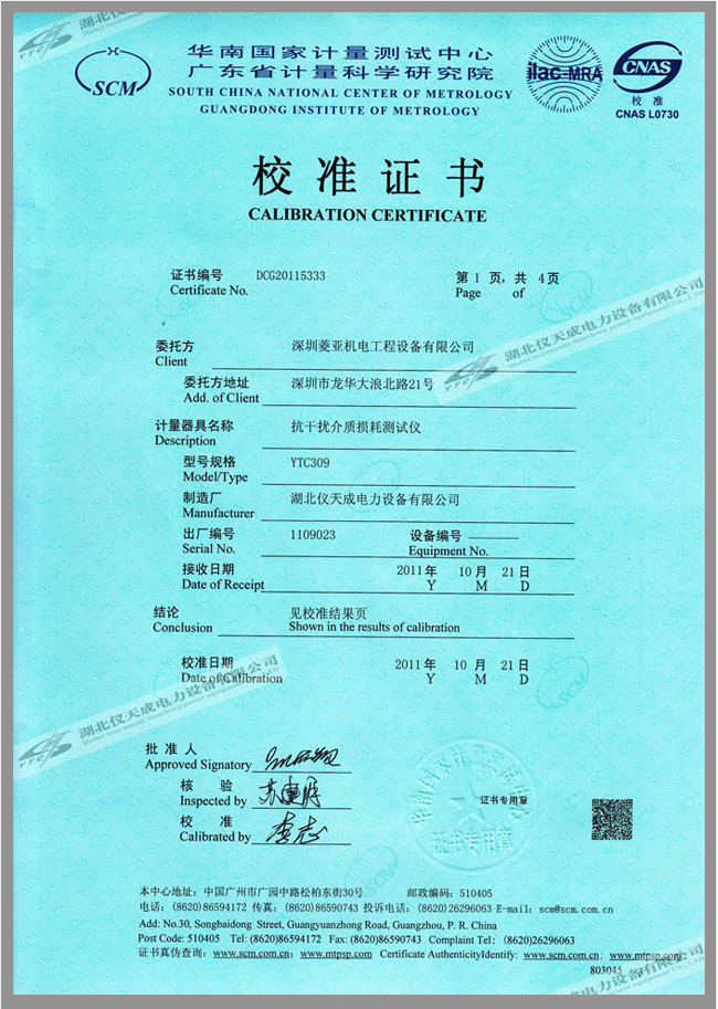 YTC309抗干擾介損自動(dòng)測(cè)試儀鑒定證書(shū)